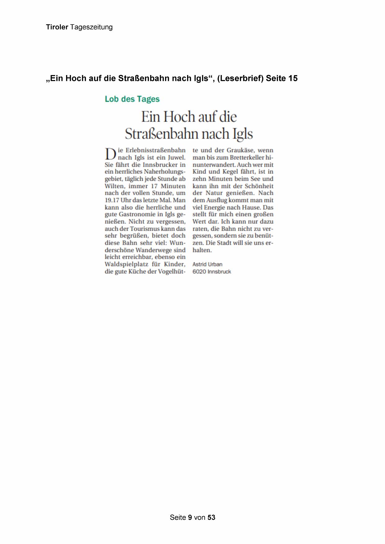 „Ein Hoch auf die Straßenbahn nach Igls“, (Leserbrief) Seite 15
