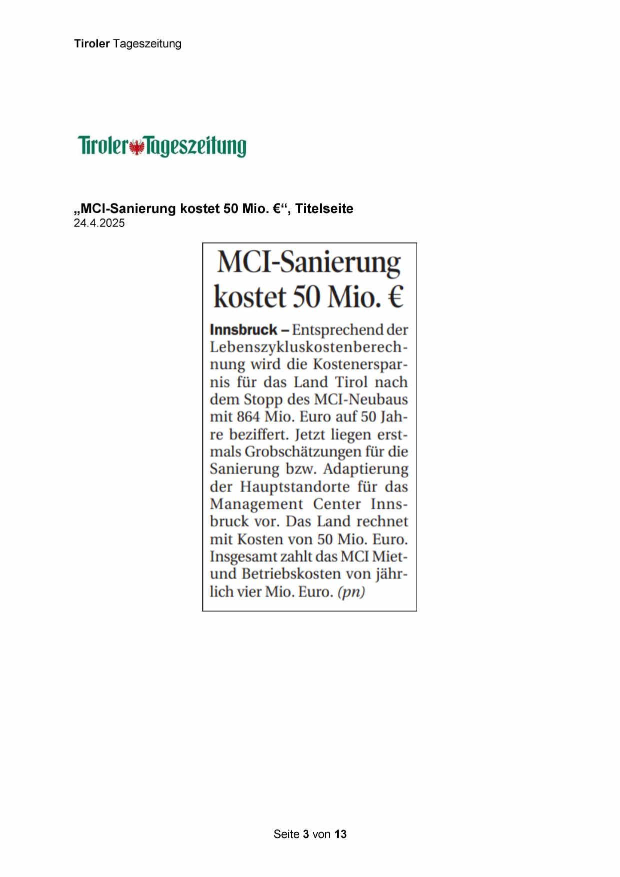 „MCI-Sanierung kostet 50 Mio. €*“, Titelseite