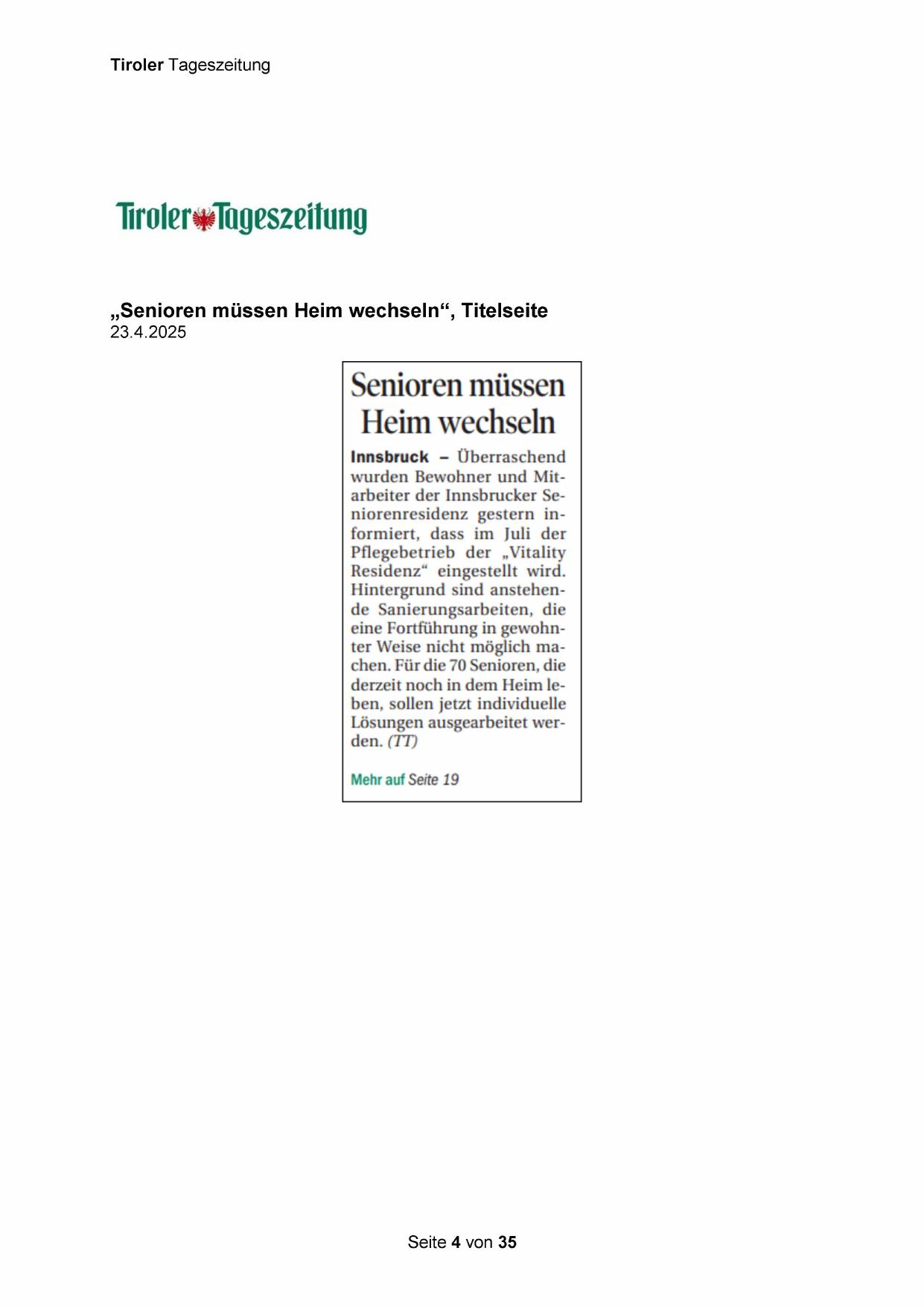 wurden Bewohner und Mitarbeiter der Innsbrucker Seniorenresidenz gestern informiert, dass im Juli der