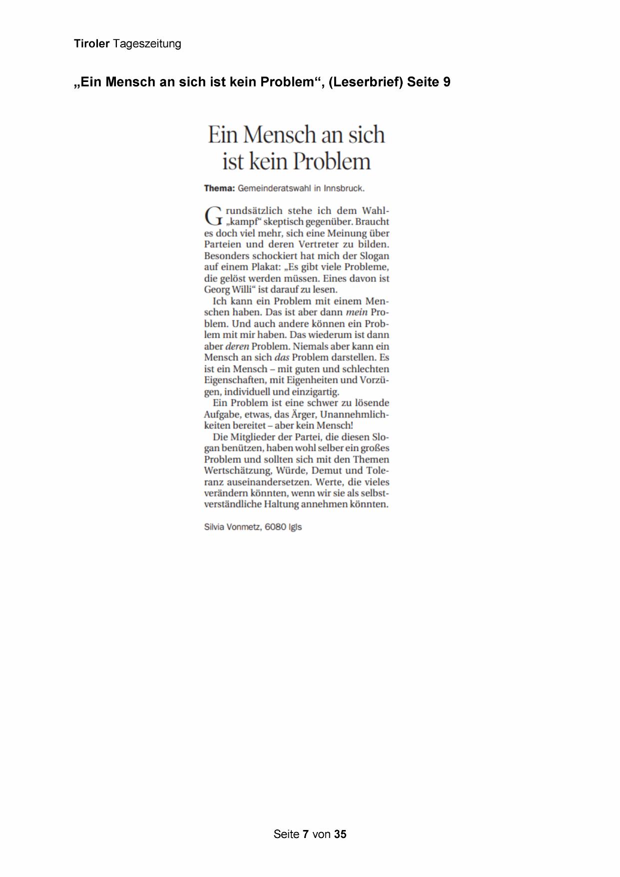 „Ein Mensch an sich ist kein Problem“, (Leserbrief) Seite 9