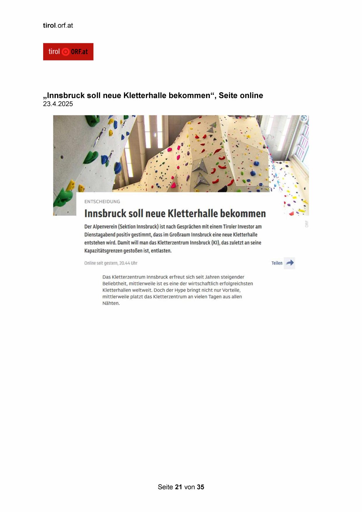 „Innsbruck soll neue Kletterhalle bekommen“, Seite online