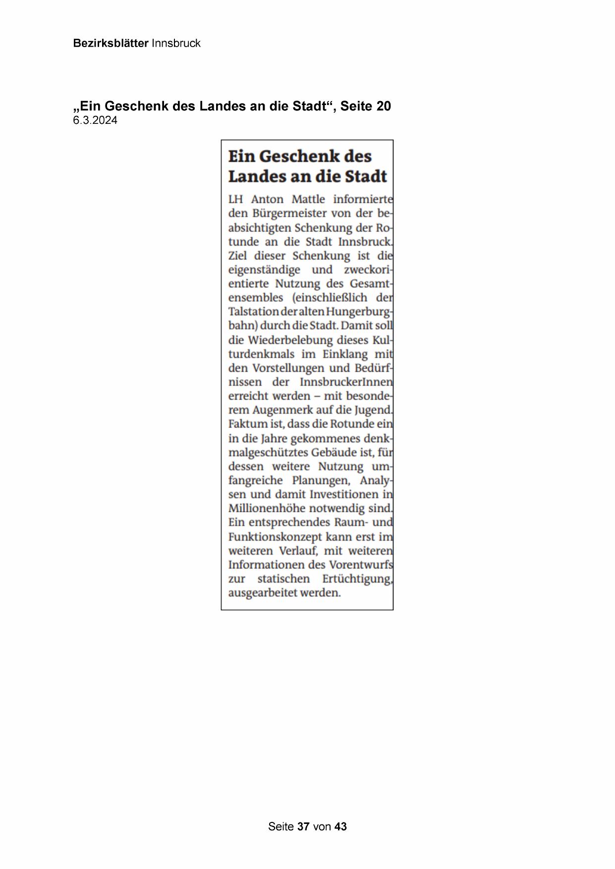 den Bürgermeister von der beabsichtigten Schenkung der Rotunde an die Stadt Innsbruck,