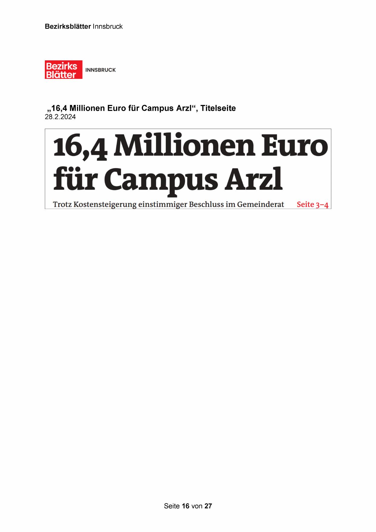 „16,4 Millionen Euro für Campus Arzl“, Titelseite