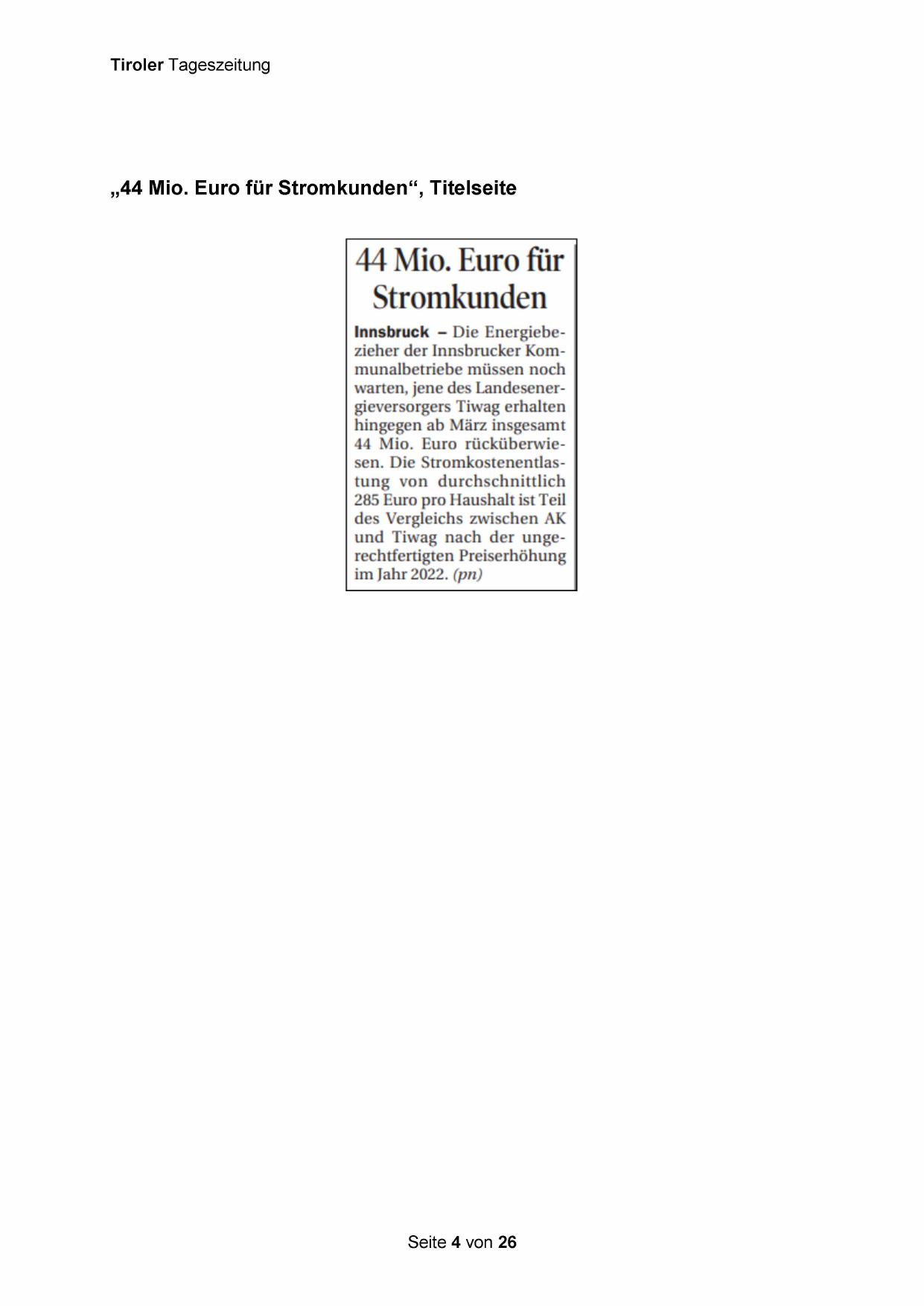 „44 Mio. Euro für Stromkunden“, Titelseite