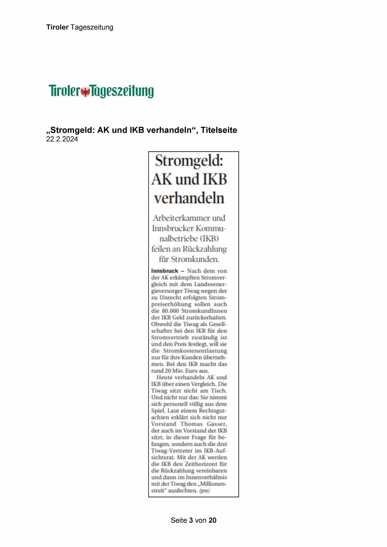 „Stromgeld: AK und IKB verhandeln“, Titelseite