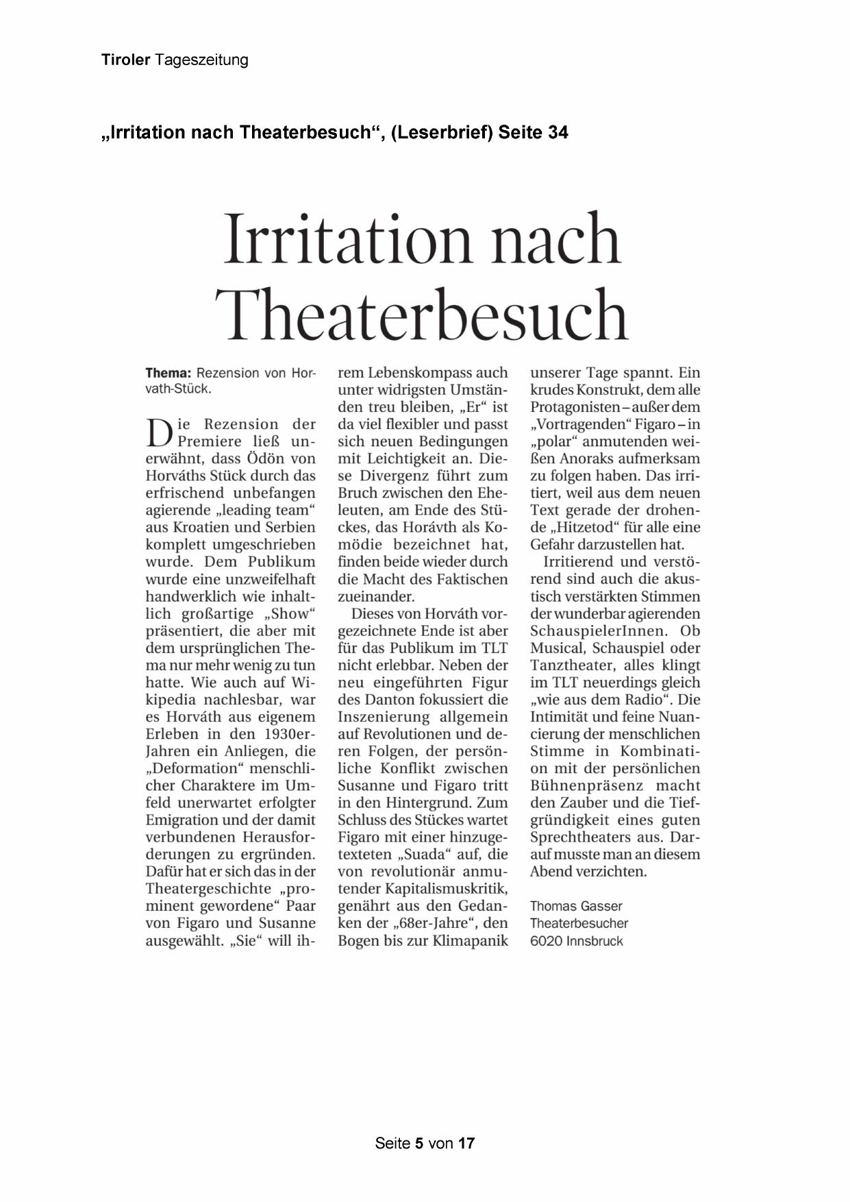 „Irritation nach Theaterbesuch“, (Leserbrief) Seite 34