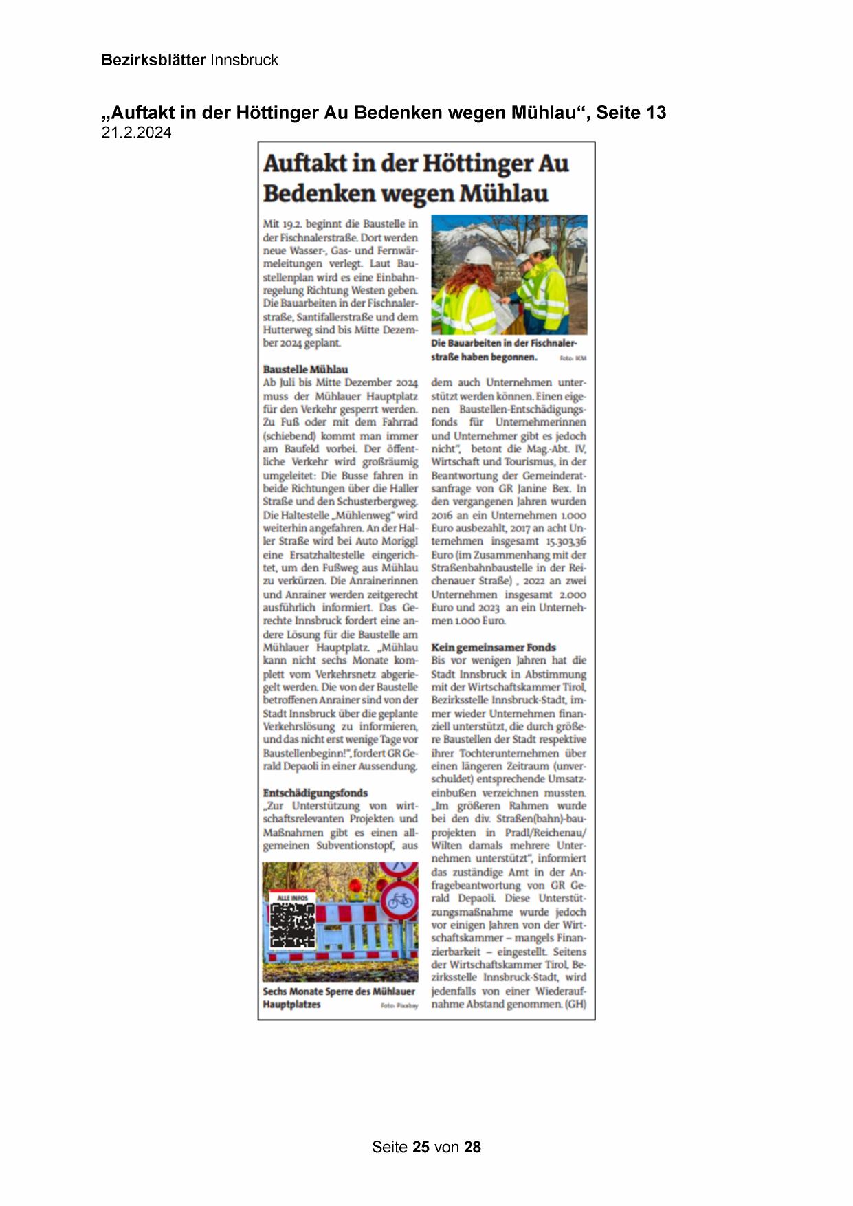 Bezirksstelle Innsbruck-Stadt, immer wieder Unternehmen finanziell unterstützt, die durch größere Baustellen der Stadt respektive