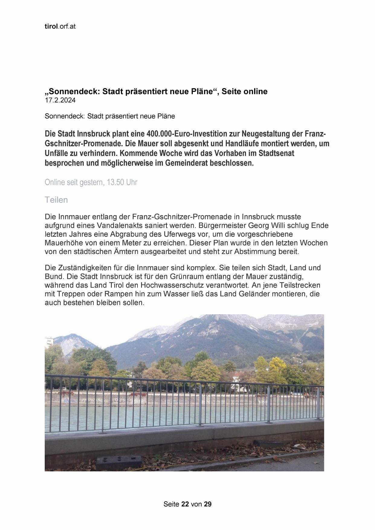 Bund. Die Stadt Innsbruck ist für den Grünraum entlang der Mauer zuständig,