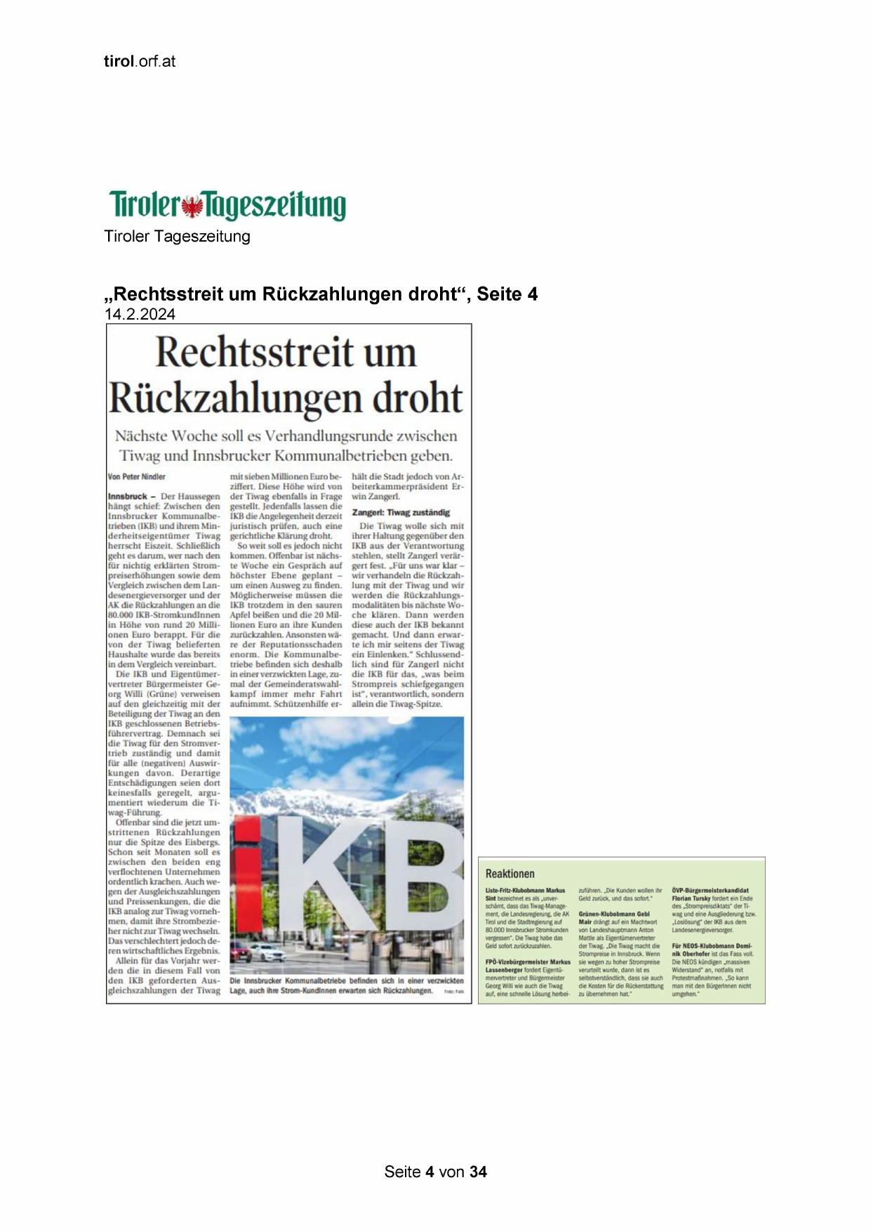 Innsbrucker Kommunalbetrieben (IKB) und ihrem Minderheitseigentümer Tiwag