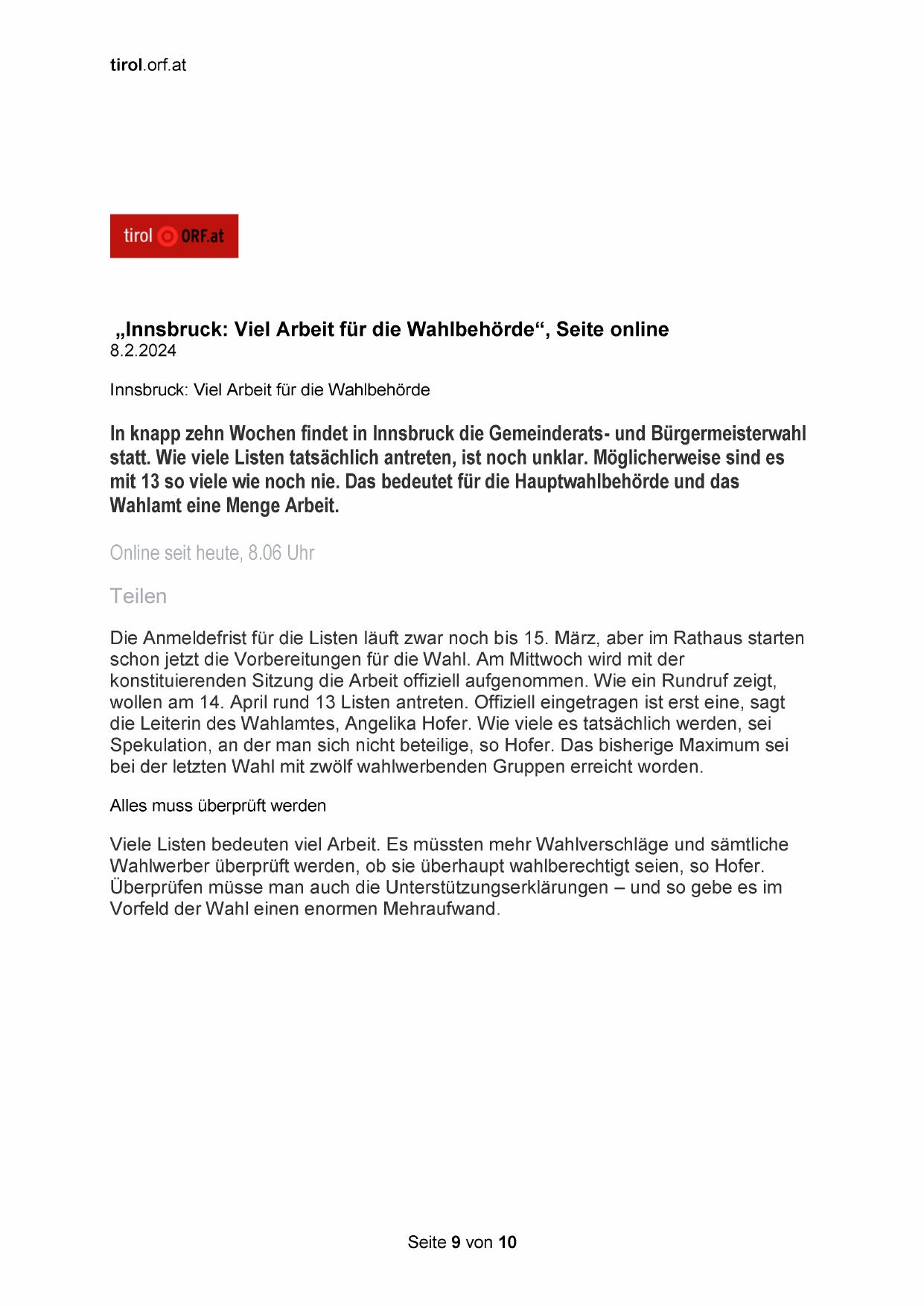„Innsbruck: Viel Arbeit für die Wahlbehörde“, Seite online