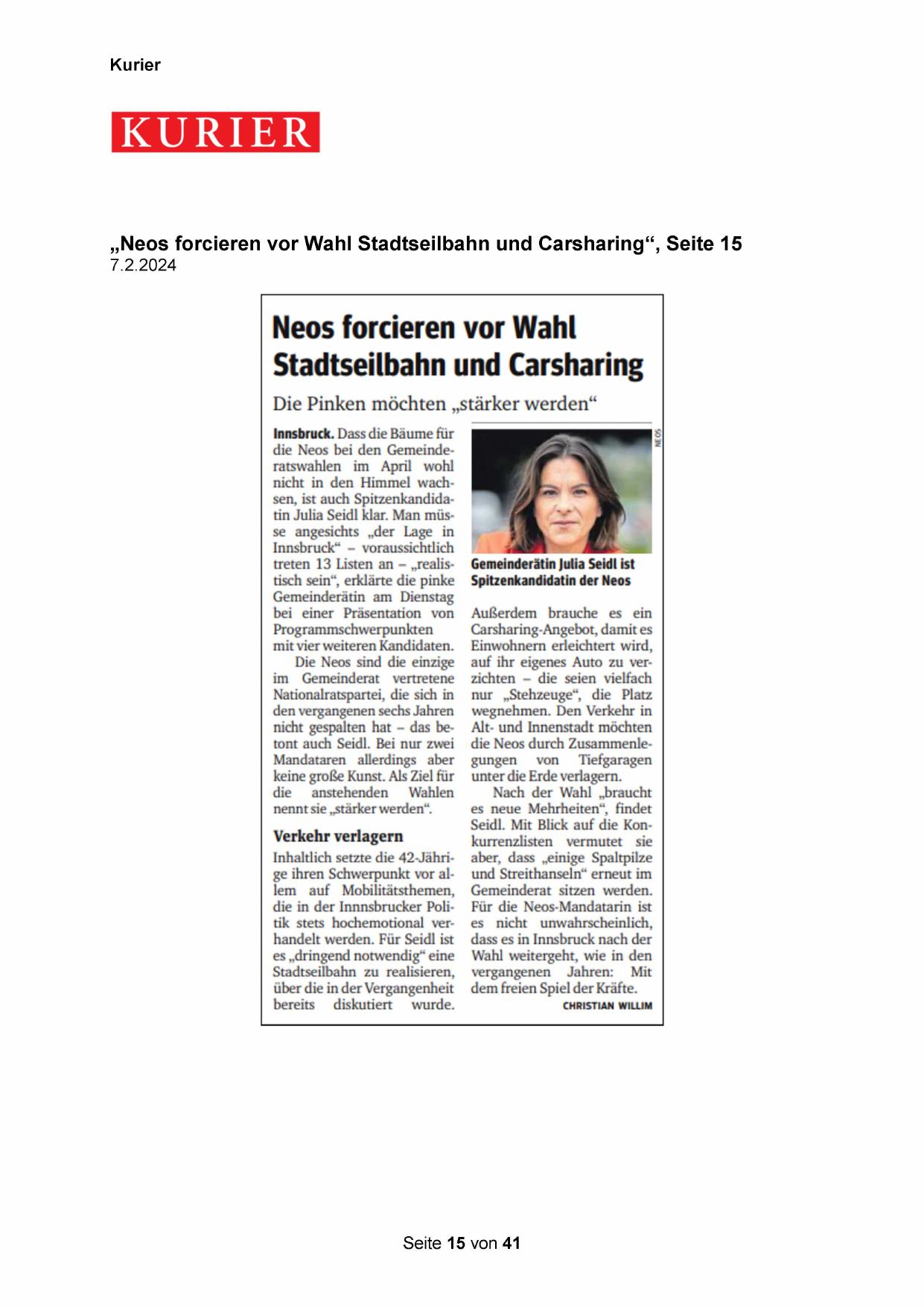 „Neos forcieren vor Wahl Stadtseilbahn und Carsharing“, Seite 15