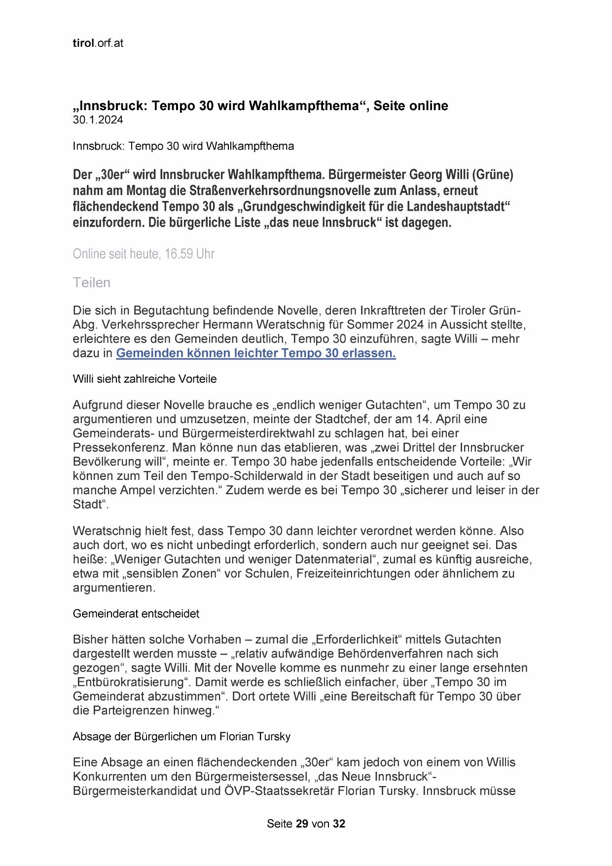 „Innsbruck: Tempo 30 wird Wahlkampfthema“‘, Seite online