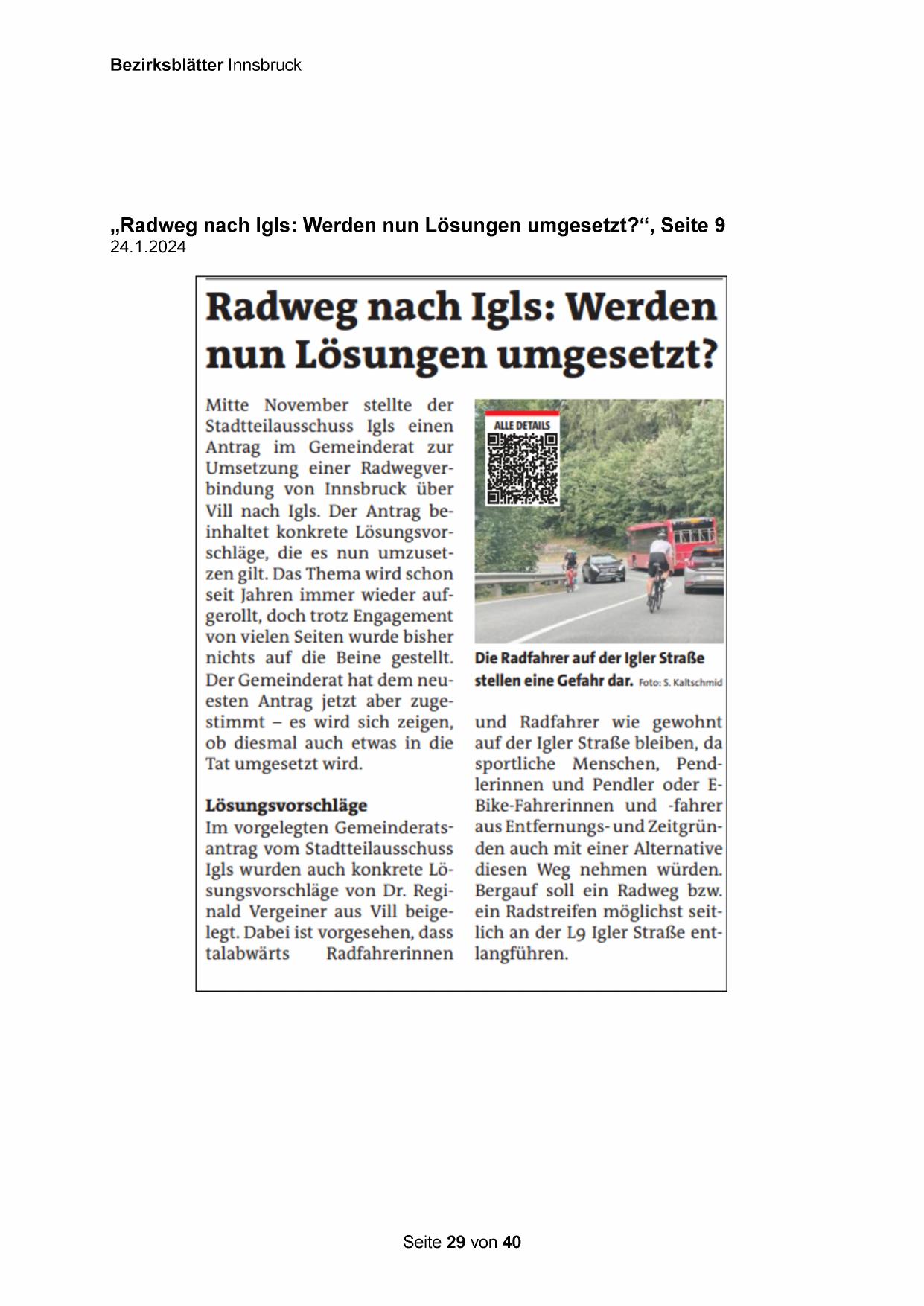 Vill nach Igls. Der Antrag beinhaltet konkrete Lösungsvorschläge, die es nun umzusetzen gilt. Das Thema wird schon
