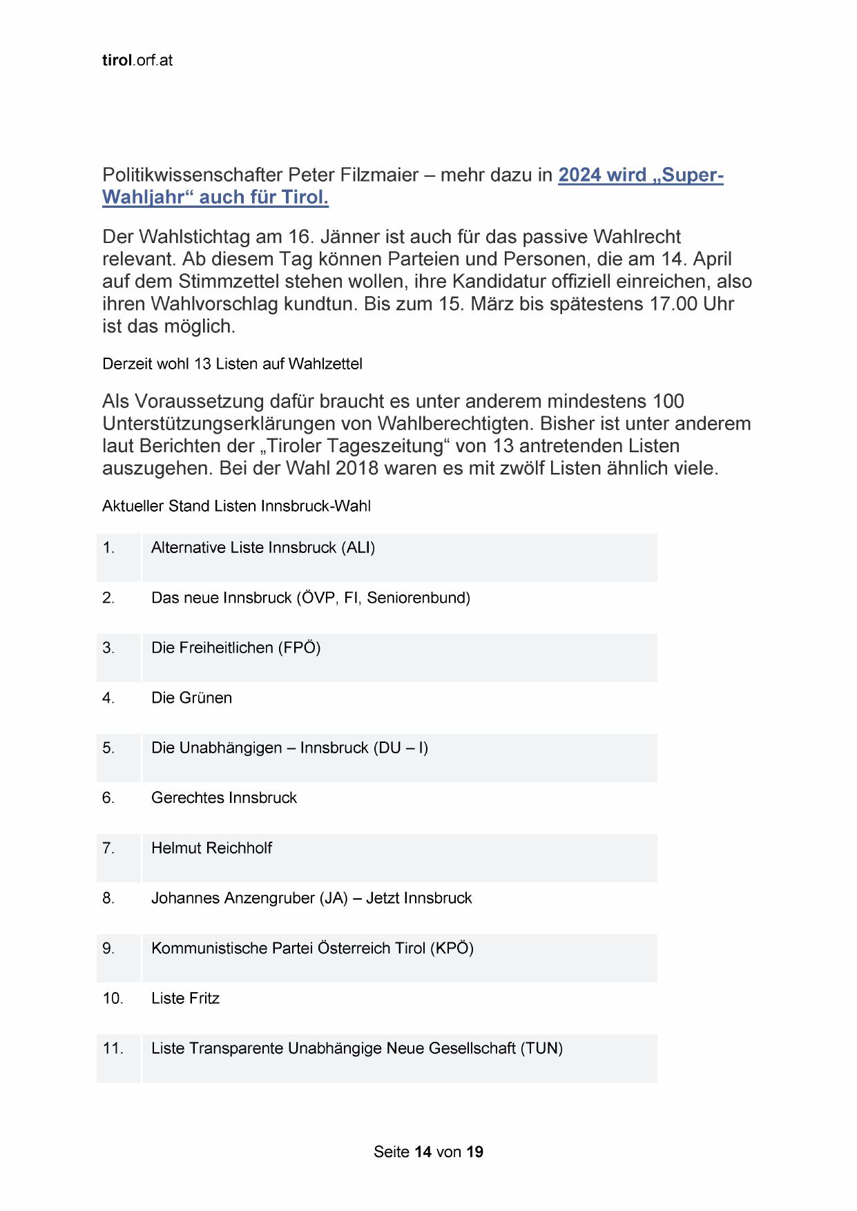 laut Berichten der „Tiroler Tageszeitung“ von 13 antretenden Listen