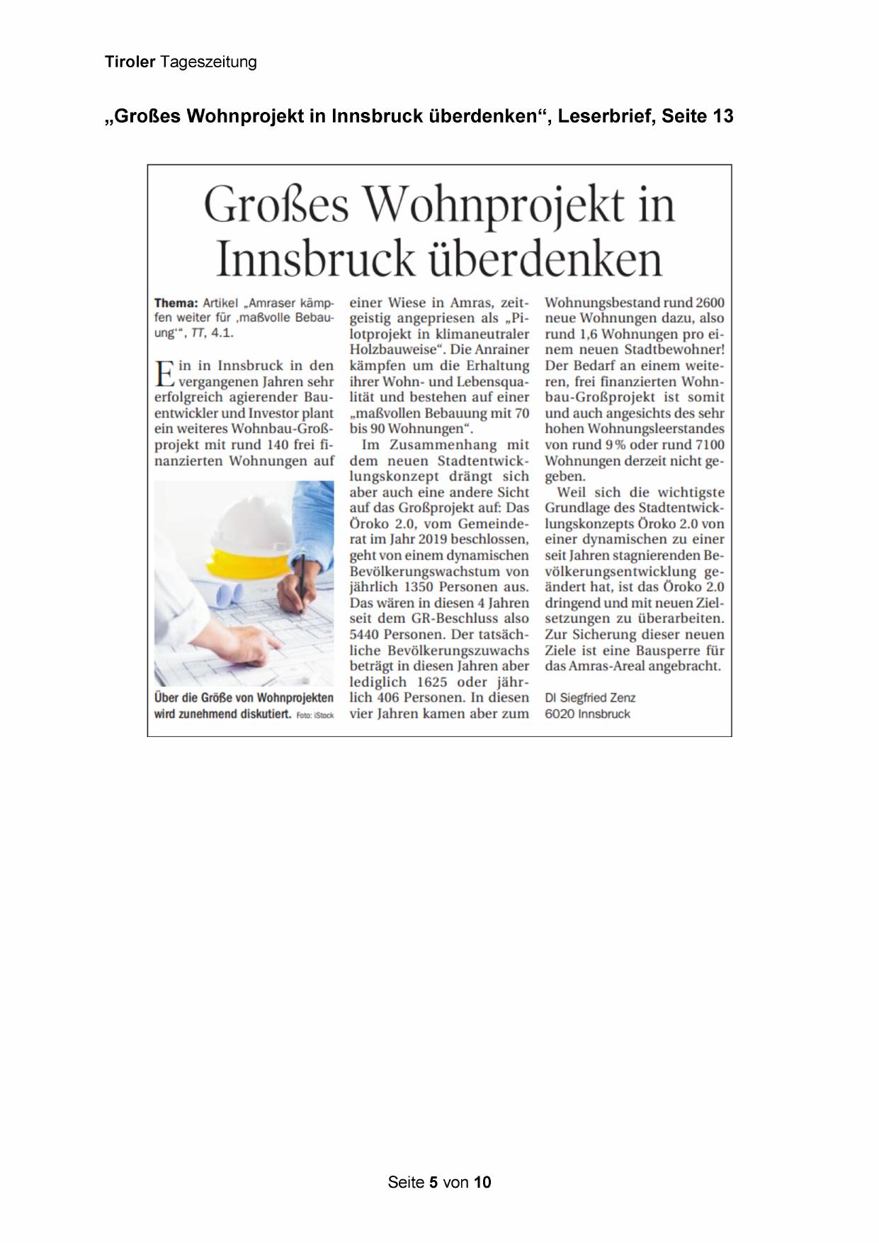 „Großes Wohnprojekt in Innsbruck überdenken“, Leserbrief, Seite 13