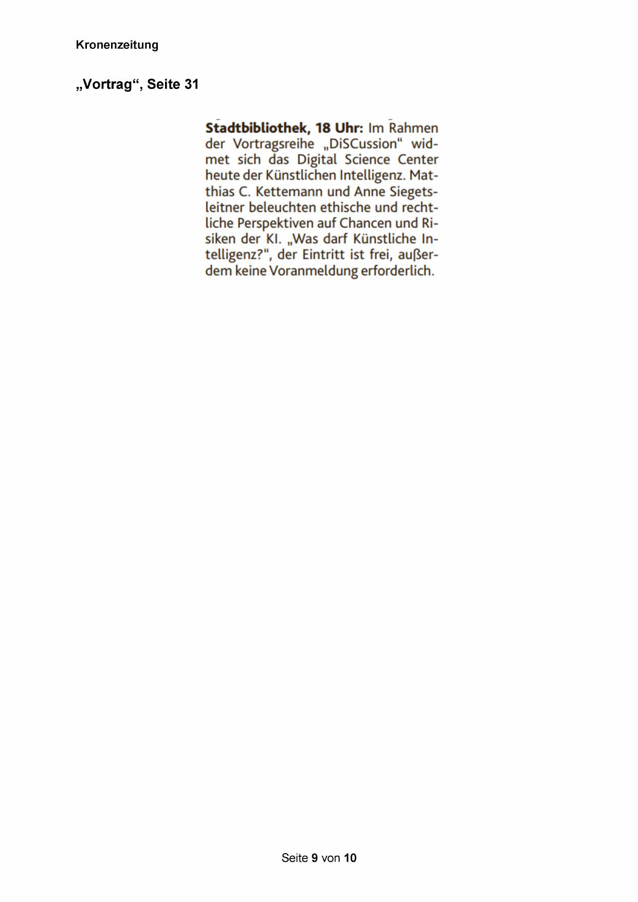 heute der Künstlichen Intelligenz. Matthias C. Kettemann und Anne Siegetsleitner beleuchten ethische und rechtliche Perspektiven auf Chancen und Risiken der KI. „Was darf Künstliche Intelligenz?“, der Eintritt ist frei, außerdem keine Voranmeldung erforderlich.