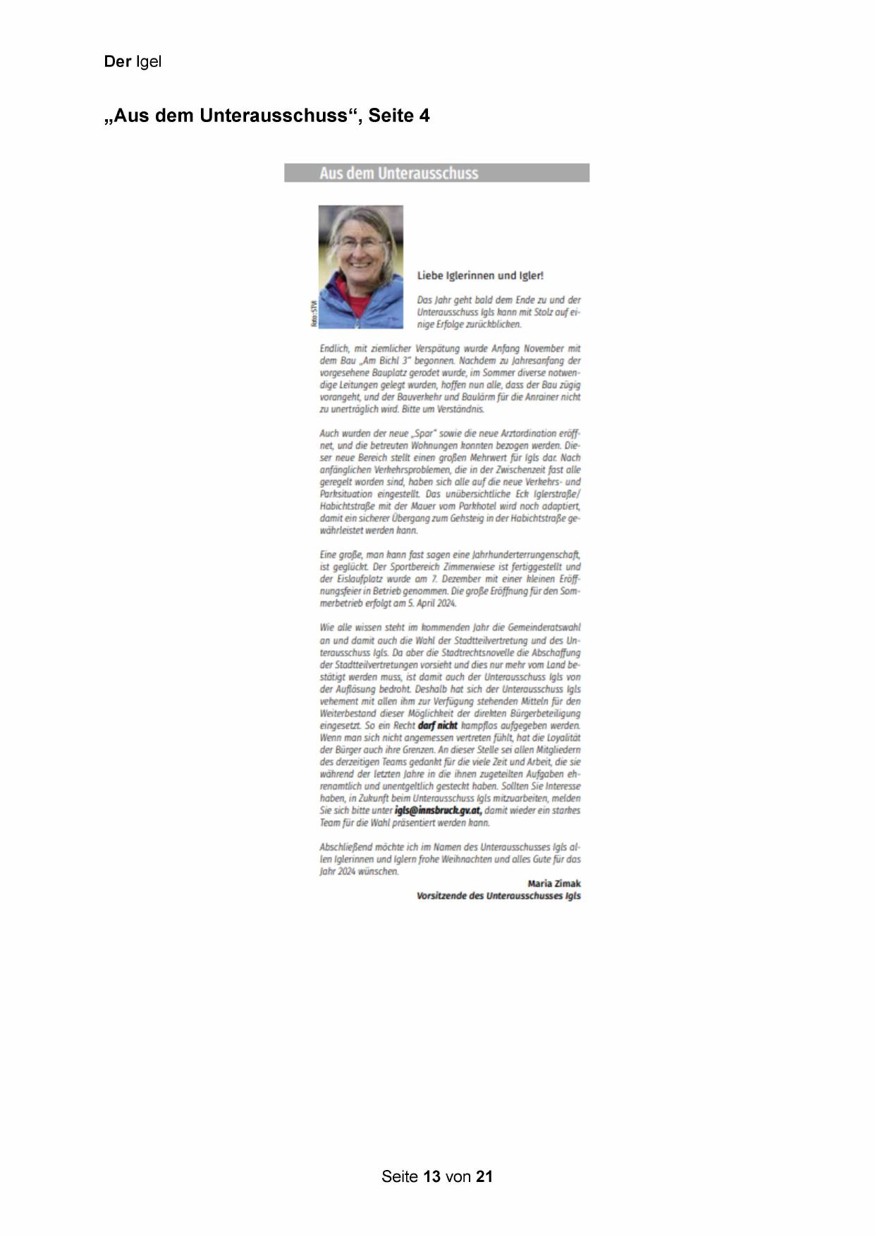 an und damit auch die Wahl der Stodtteilvertretung und des Unterausschuss Igls. Da aber die Stodtrechtsnovelle die Abschaffung