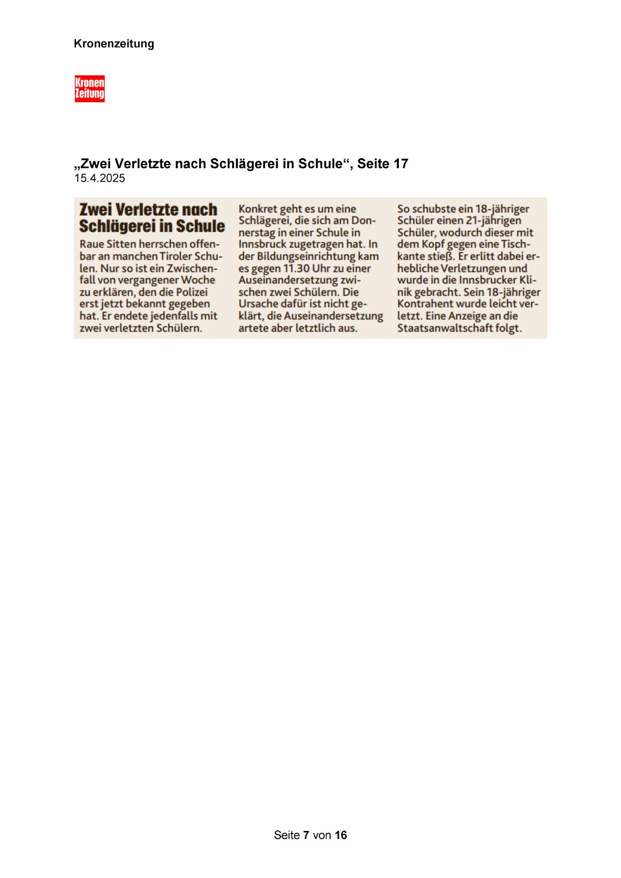 „Zwei Verletzte nach Schlägerei in Schule“, Seite 17