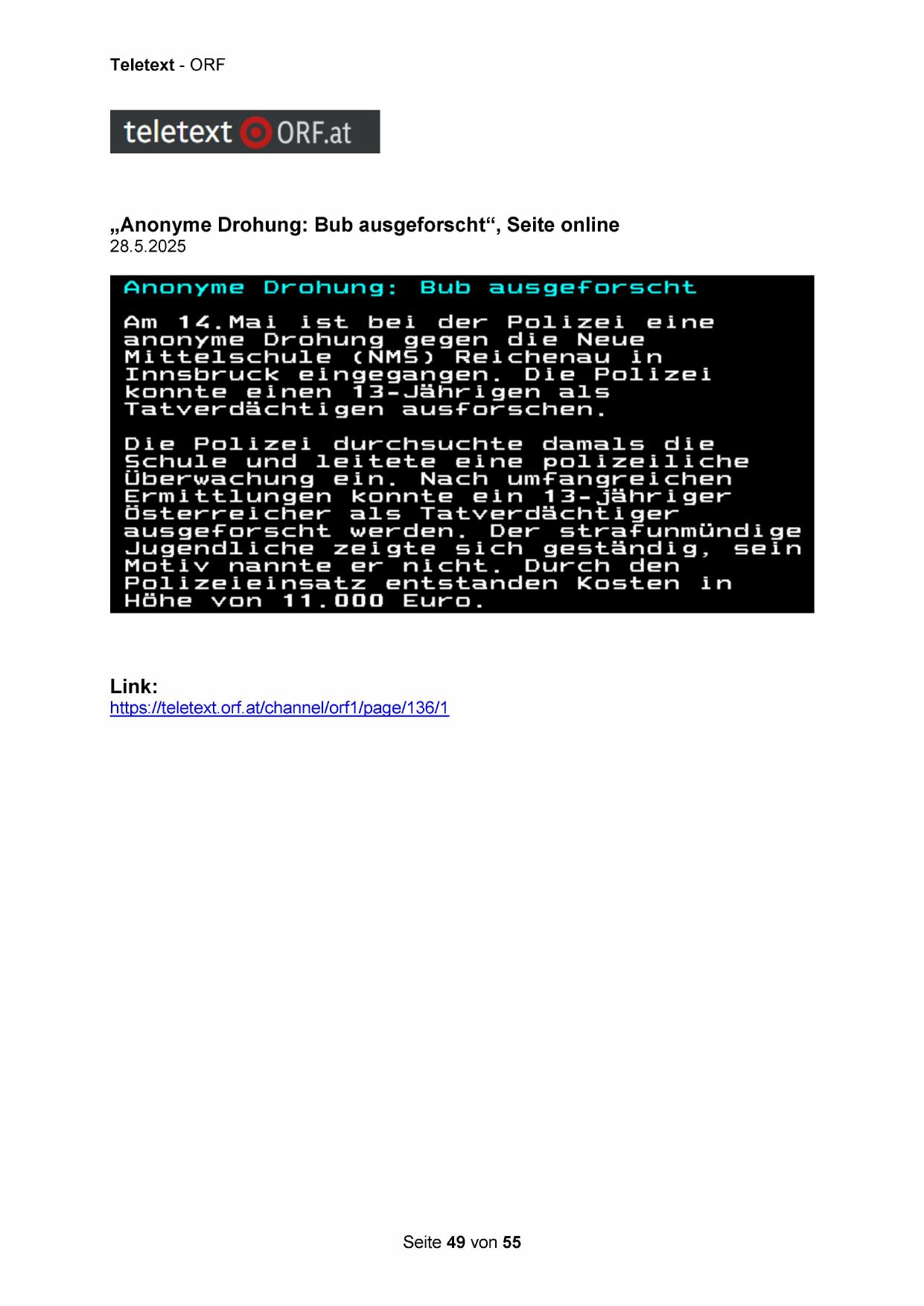 „Anonyme Drohung: Bub ausgeforscht“, Seite online