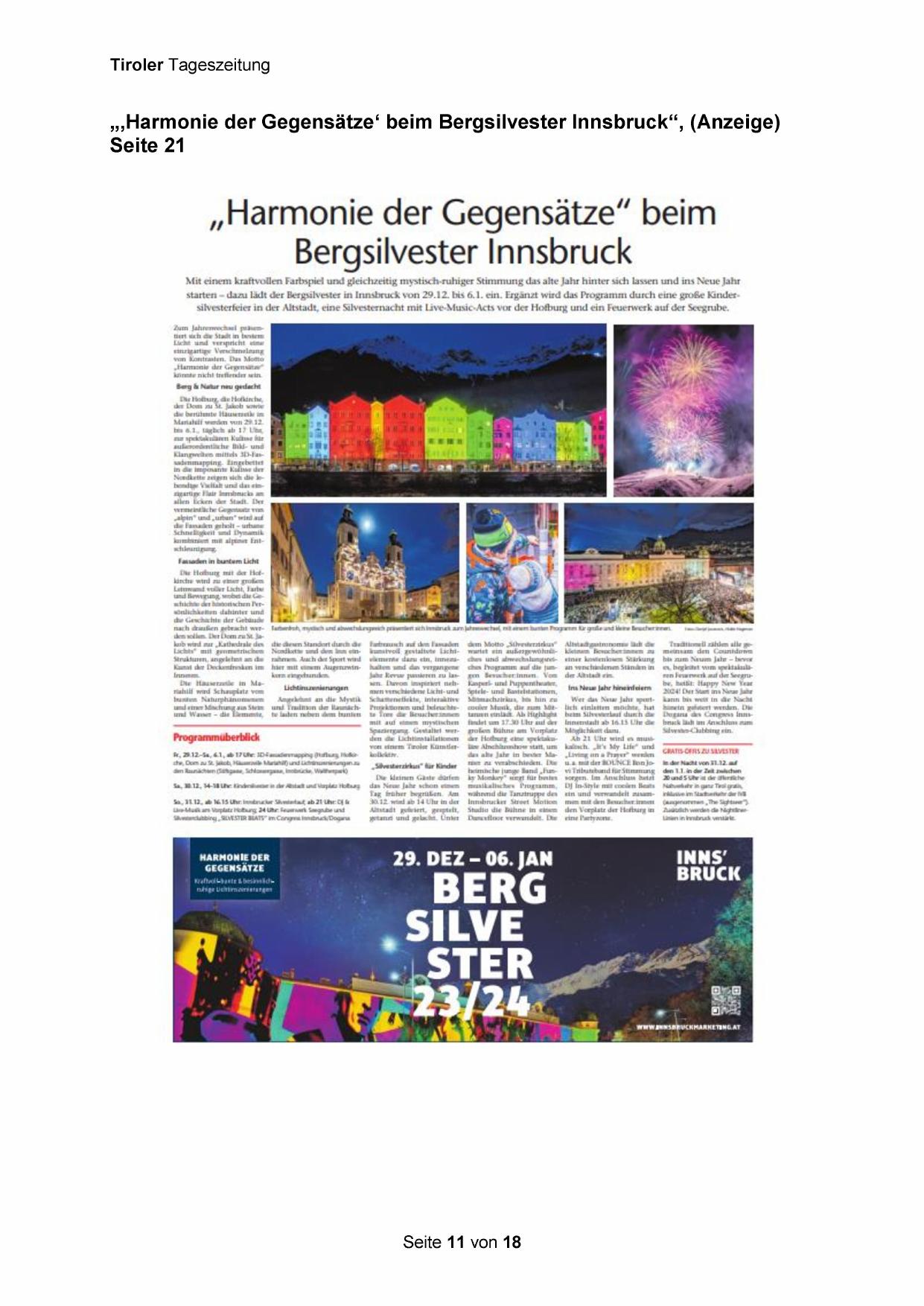 „‚Harmonie der Gegensätze‘ beim Bergsilvester Innsbruck“, (Anzeige)