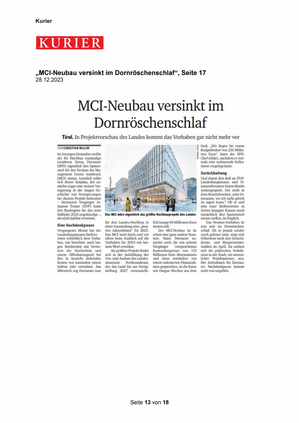 „MCI-Neubau versinkt im Dornröschenschlaf“, Seite 17