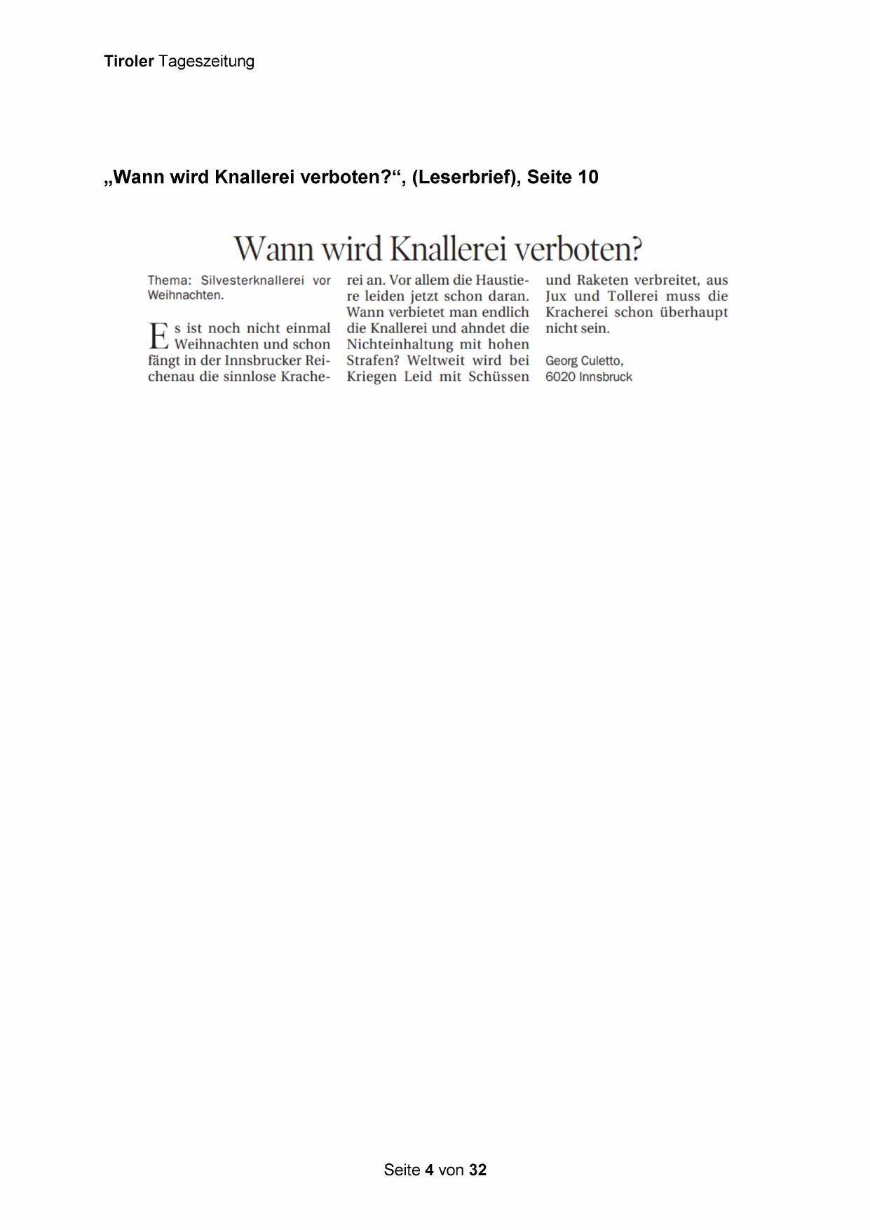„Wann wird Knallerei verboten?“, (Leserbrief), Seite 10