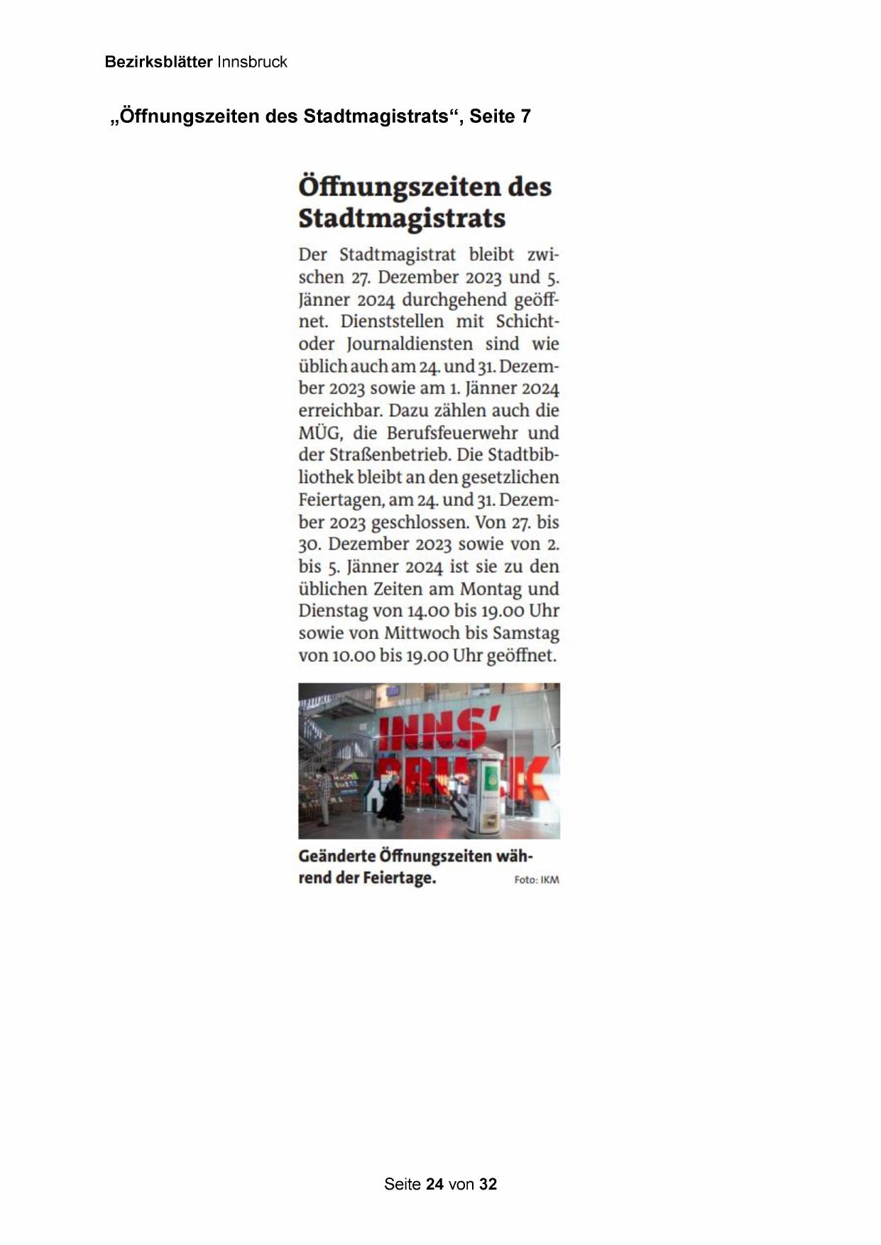 üblich auch am 24. und 31. Dezember 2023 sowie am 1. Jänner 2024