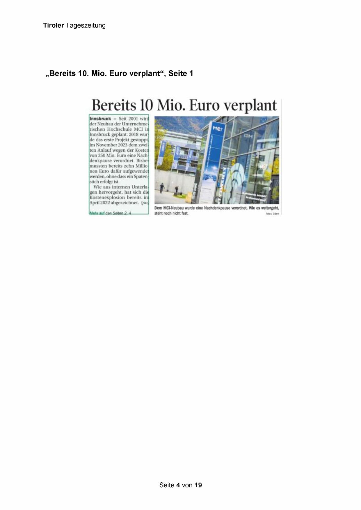 „Bereits 10. Mio. Euro verplant“, Seite 1