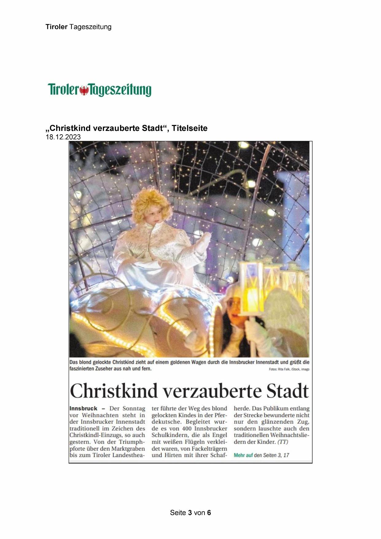 Das blond gelockte Christkind zieht auf einem goldenen Wagen durch die Innsbrucker Innenstadt und grüßt die
