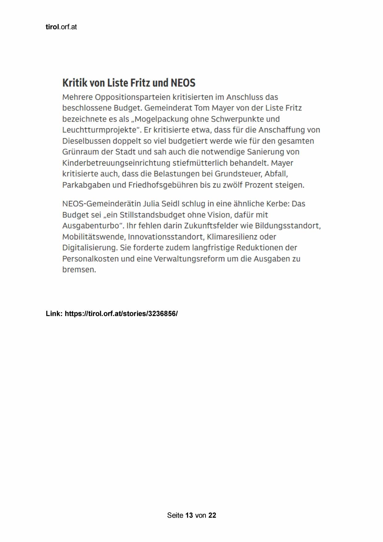 beschlossene Budget. Gemeinderat Tom Mayer von der Liste Fritz