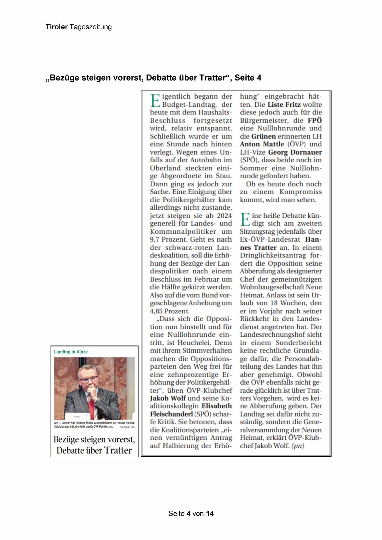 „Bezüge steigen vorerst, Debatte über Tratter‘“, Seite 4