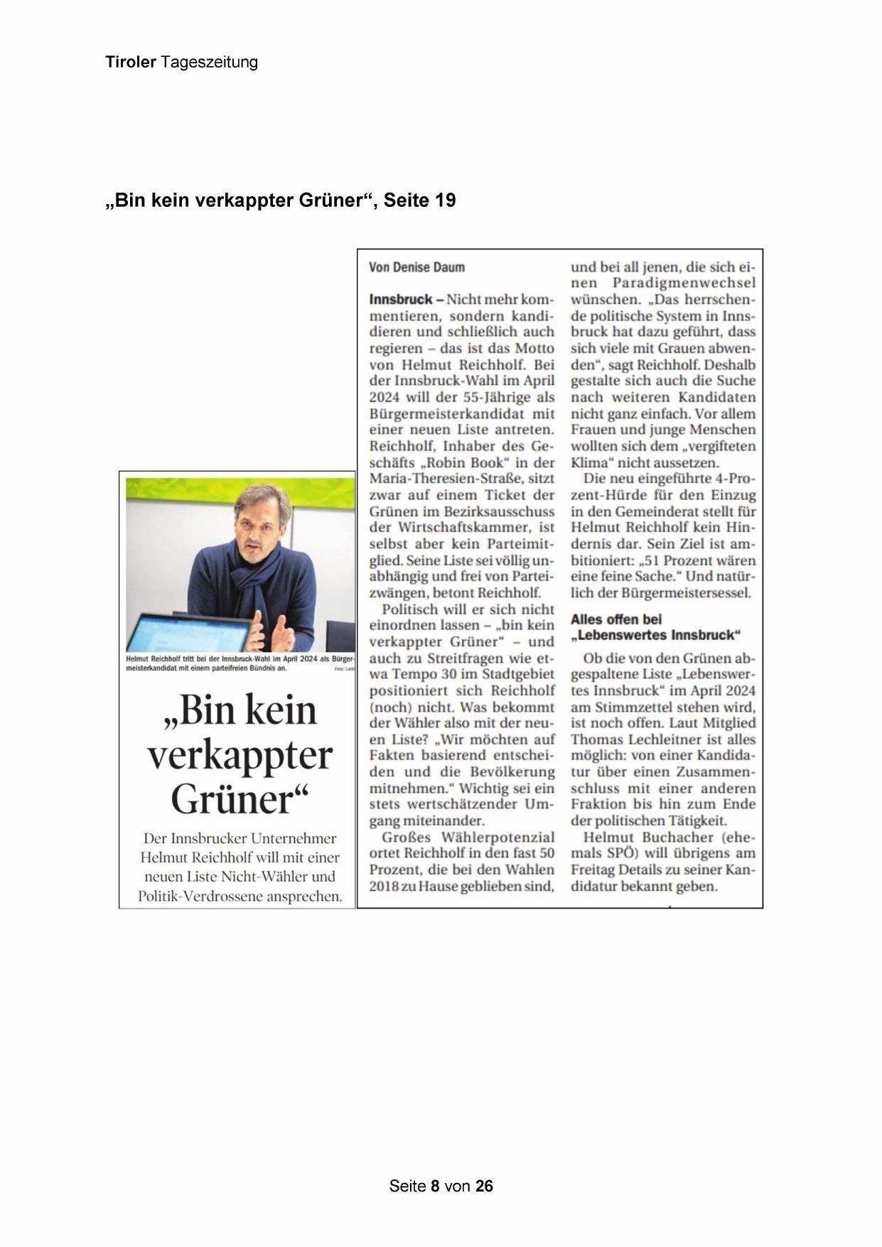 Helmut Reichholf tritt bei der Innsbruck-Wahl im April 2024 als Bürgermeisterkandidat mit einem parteifreien Bündnis an.
