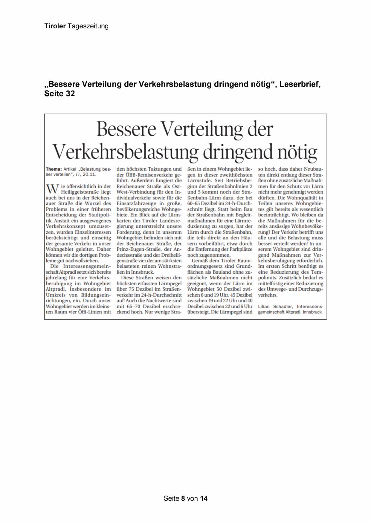 Thema: Artikel „Belastung besser verteilen“, TT, 20.11.