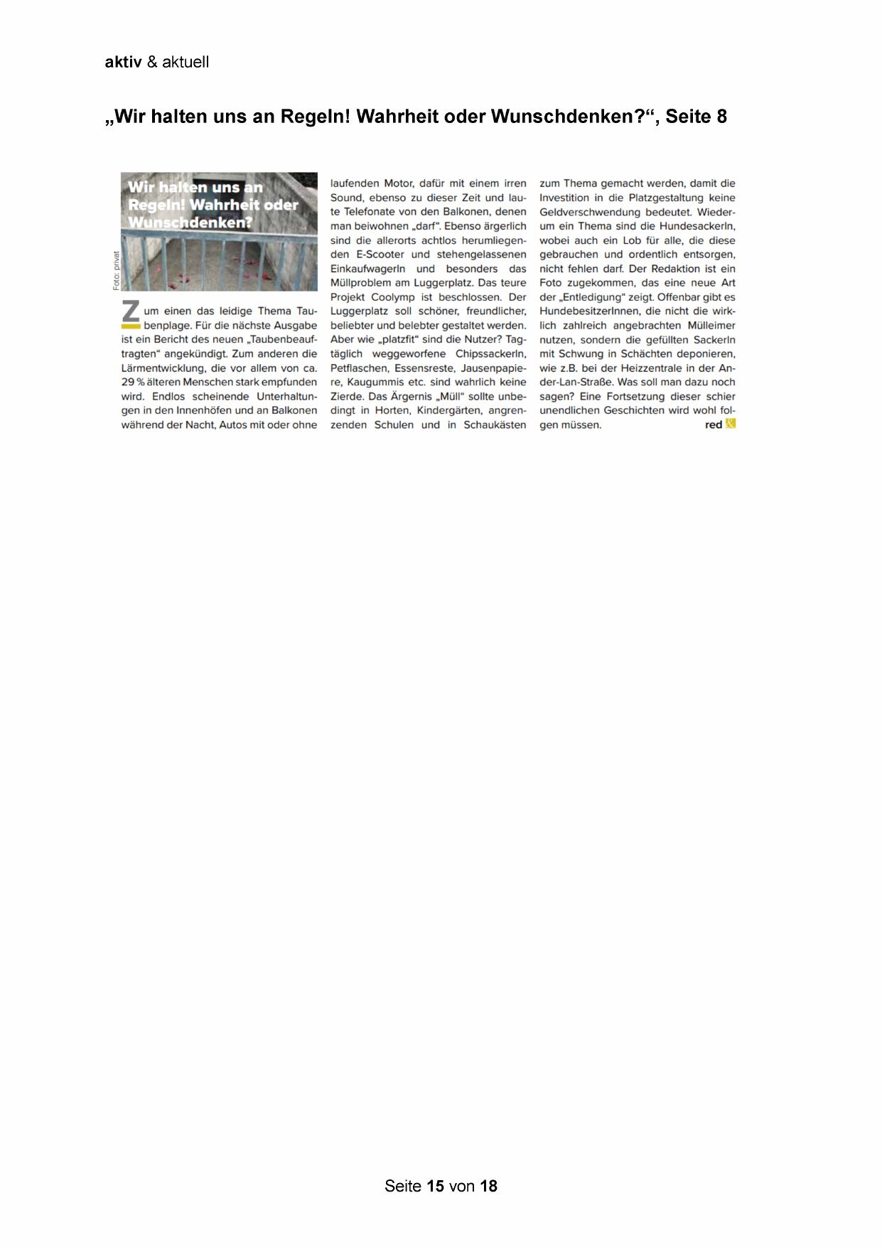 ist ein Bericht des neuen „Taubenbeauftragten“ angekündigt. Zum anderen die