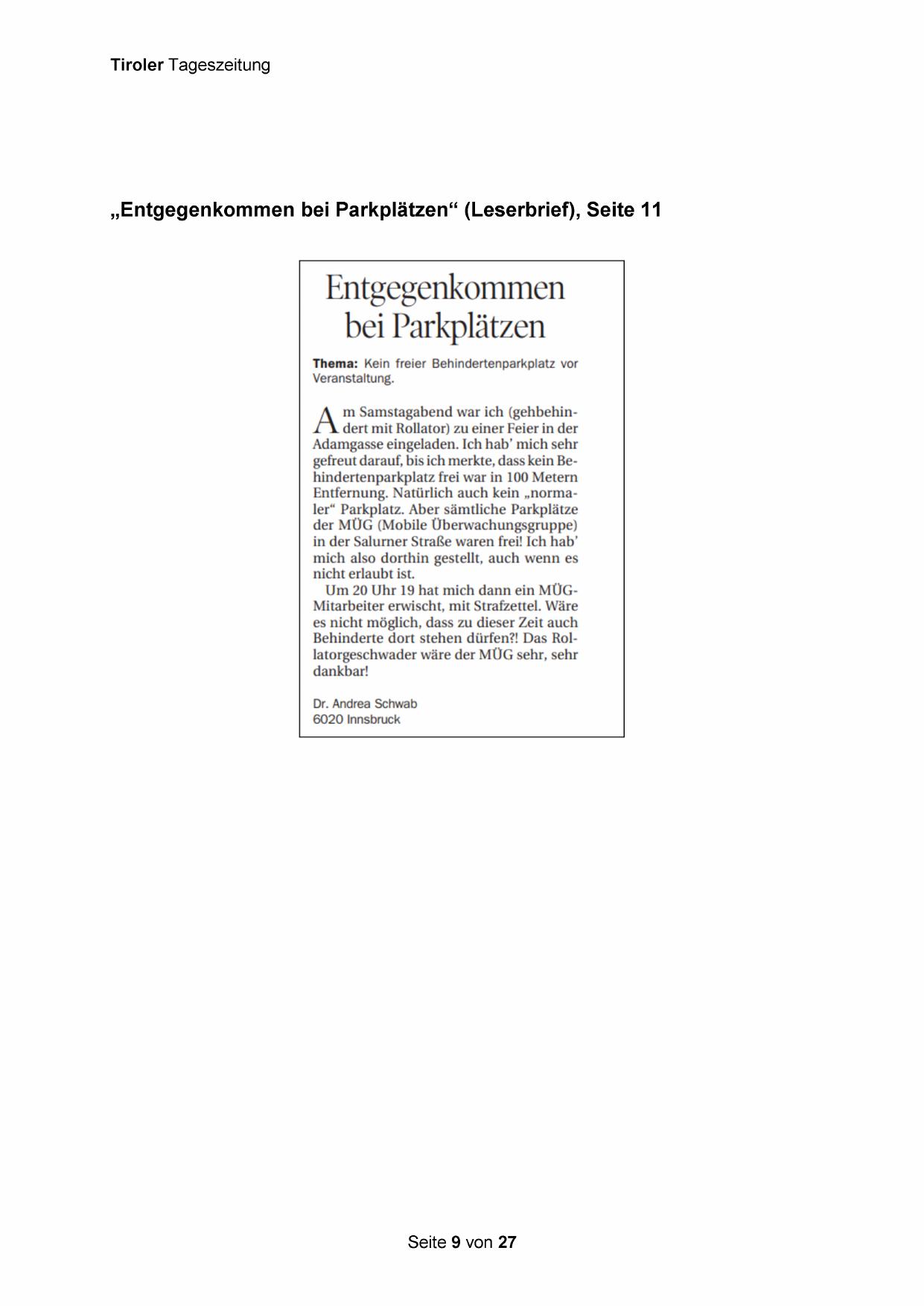 „Entgegenkommen bei Parkplätzen“ (Leserbrief), Seite 11