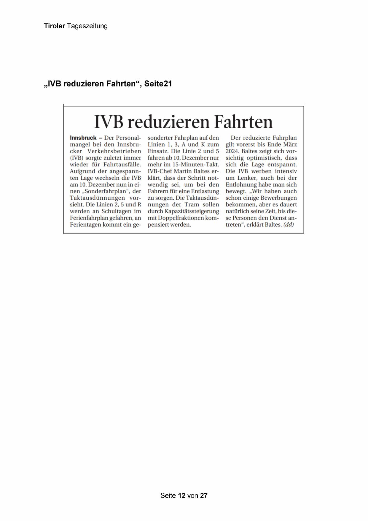 Innsbruck —- Der Personalmangel bei den Innsbrucker Verkehrsbetrieben