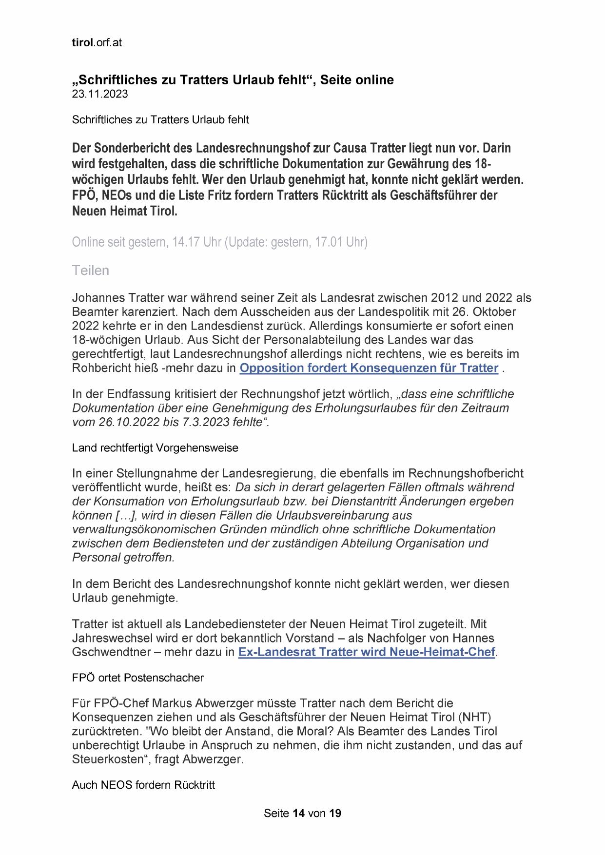 „Schriftliches zu Tratters Urlaub fehlt‘“, Seite online