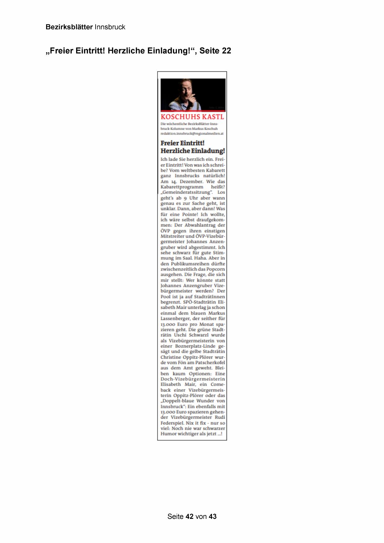 Ich lade Sie herzlich ein. Freier Eintritt! Von was ich schreibe? Vom weltbesten Kabarett