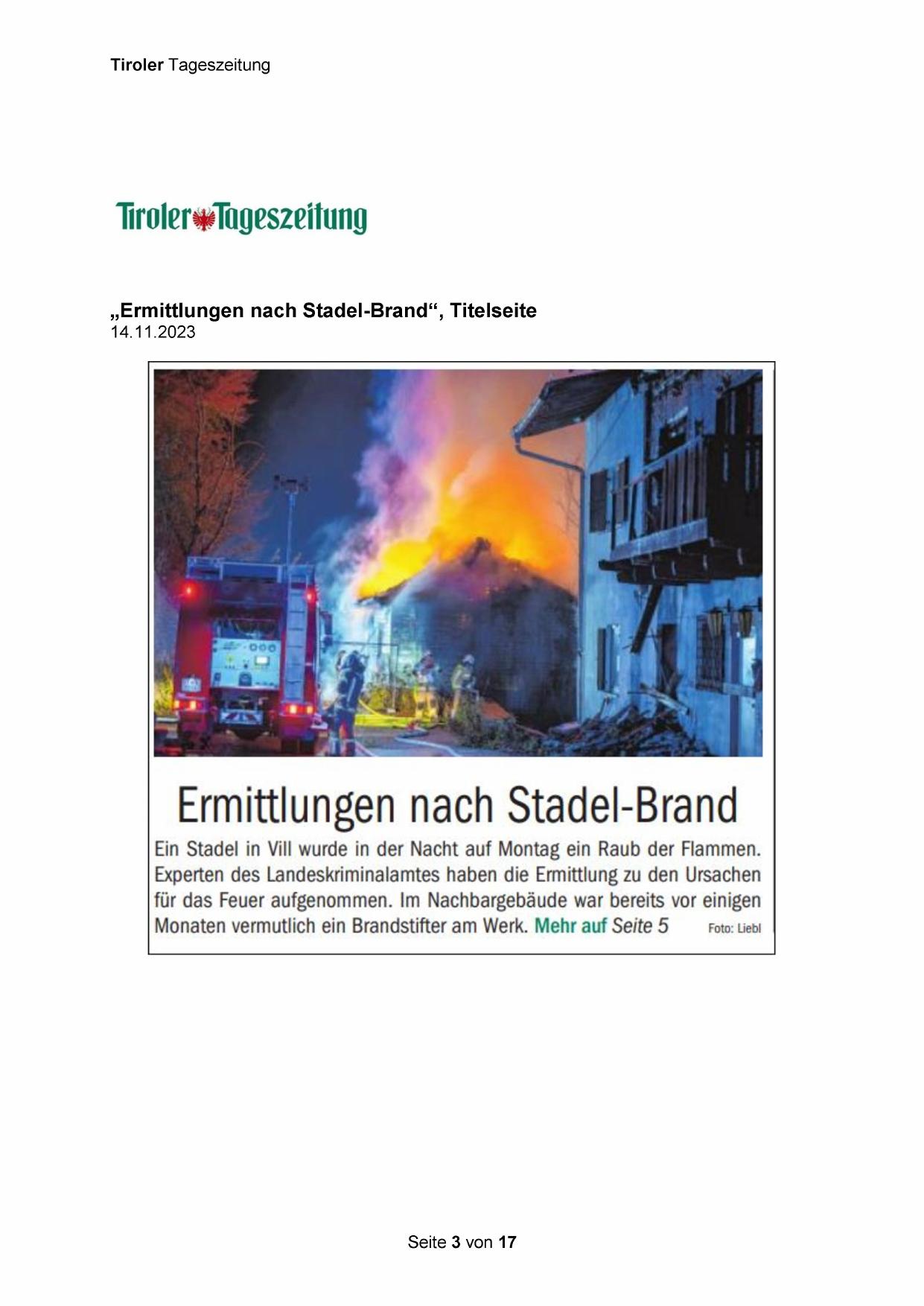 „Ermittlungen nach Stadel-Brand“, Titelseite
