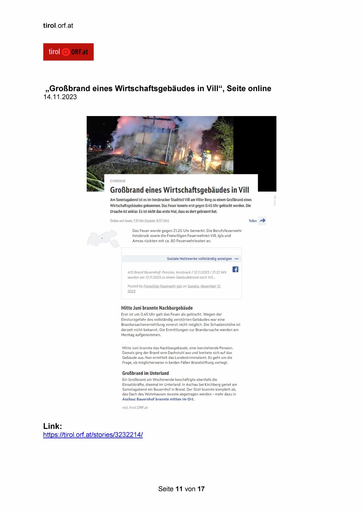 „Großbrand eines Wirtschaftsgebäudes in Vill“, Seite online