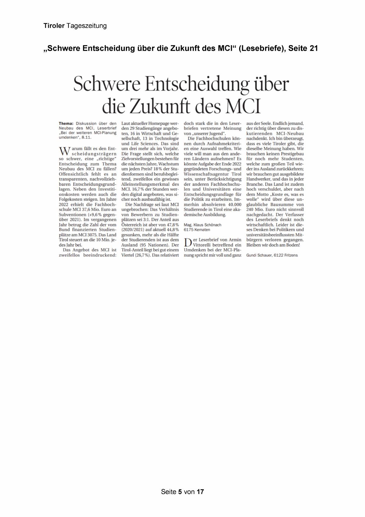 „Schwere Entscheidung über die Zukunft des MCI“ (Lesebriefe), Seite 21