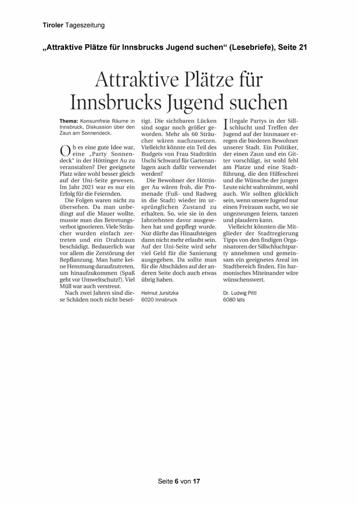 „Attraktive Plätze für Innsbrucks Jugend suchen“ (Lesebriefe), Seite 21