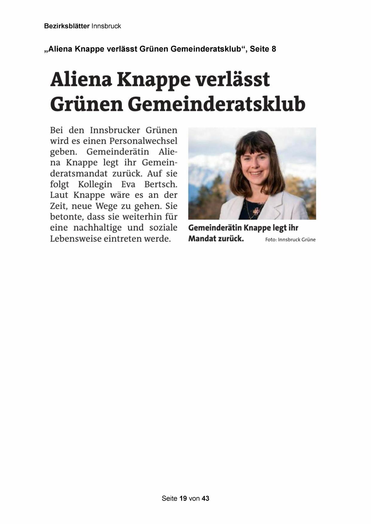 „Aliena Knappe verlässt Grünen Gemeinderatsklub“, Seite 8