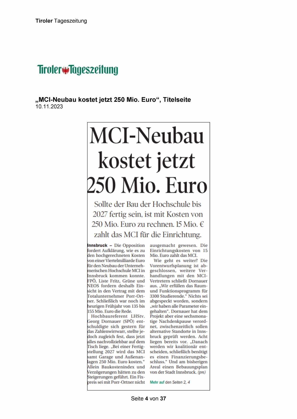„MCI-Neubau kostet jetzt 250 Mio. Euro“, Titelseite