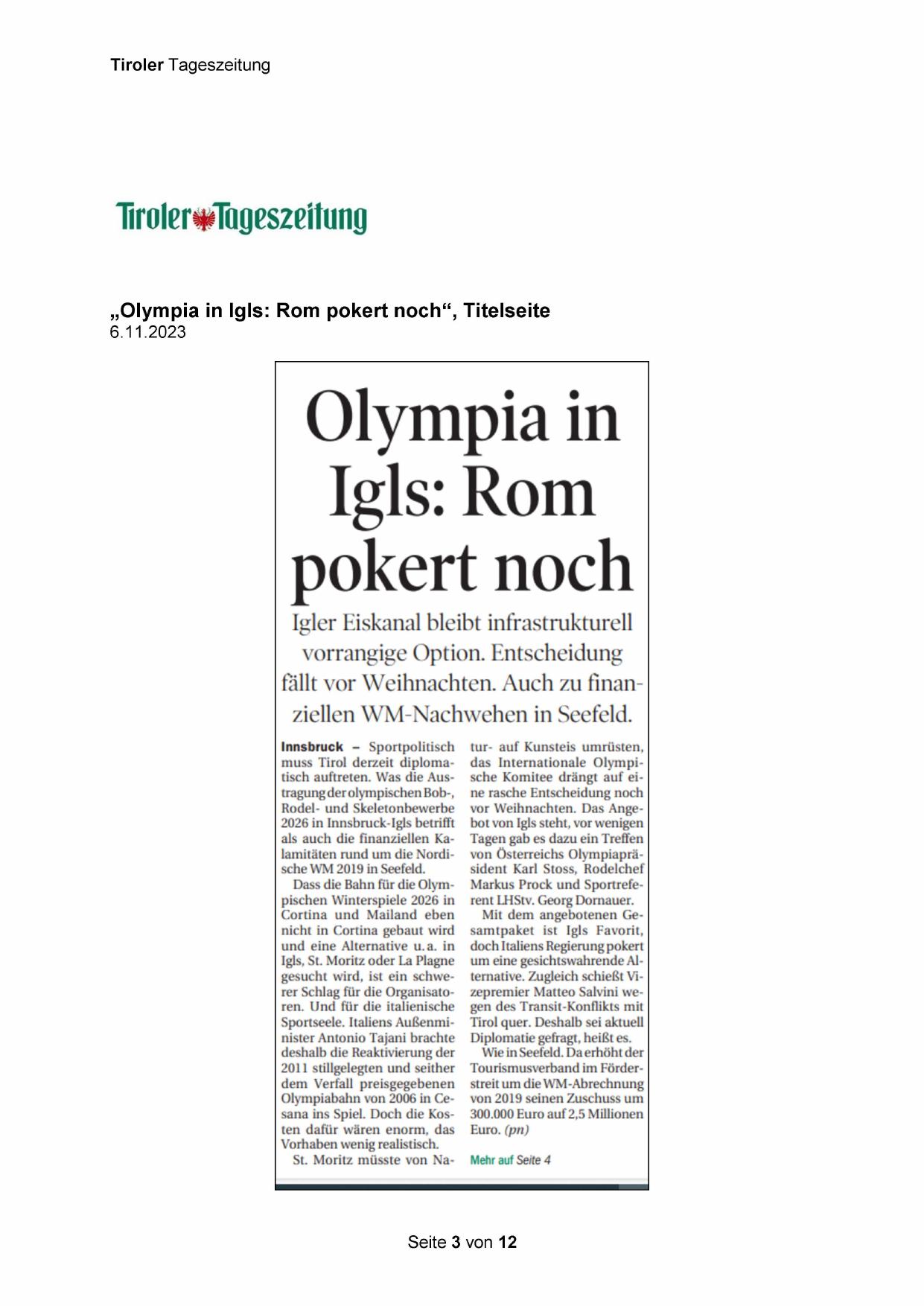 „Olympia in Igls: Rom pokert noch“, Titelseite