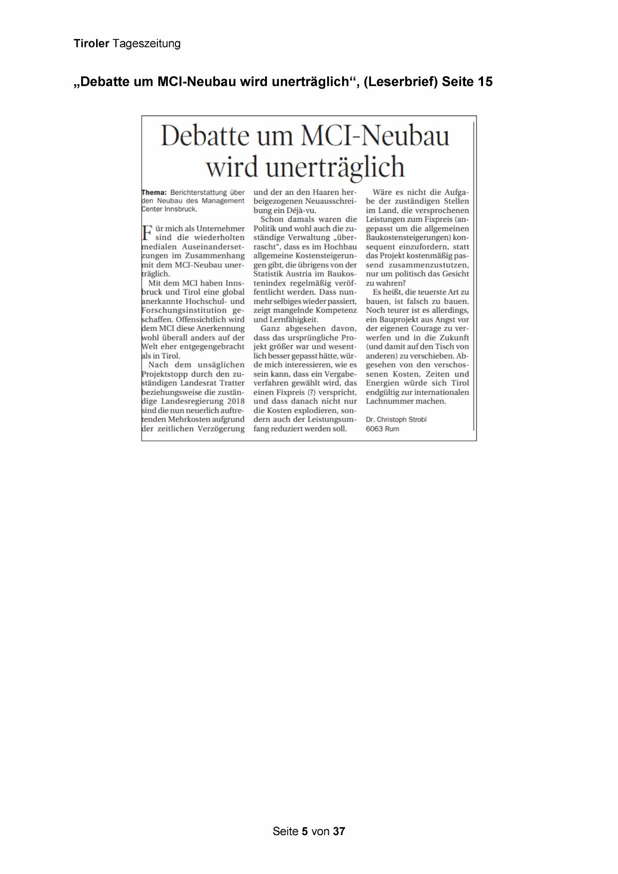 „Debatte um MCI-Neubau wird unerträglich“, (Leserbrief) Seite 15