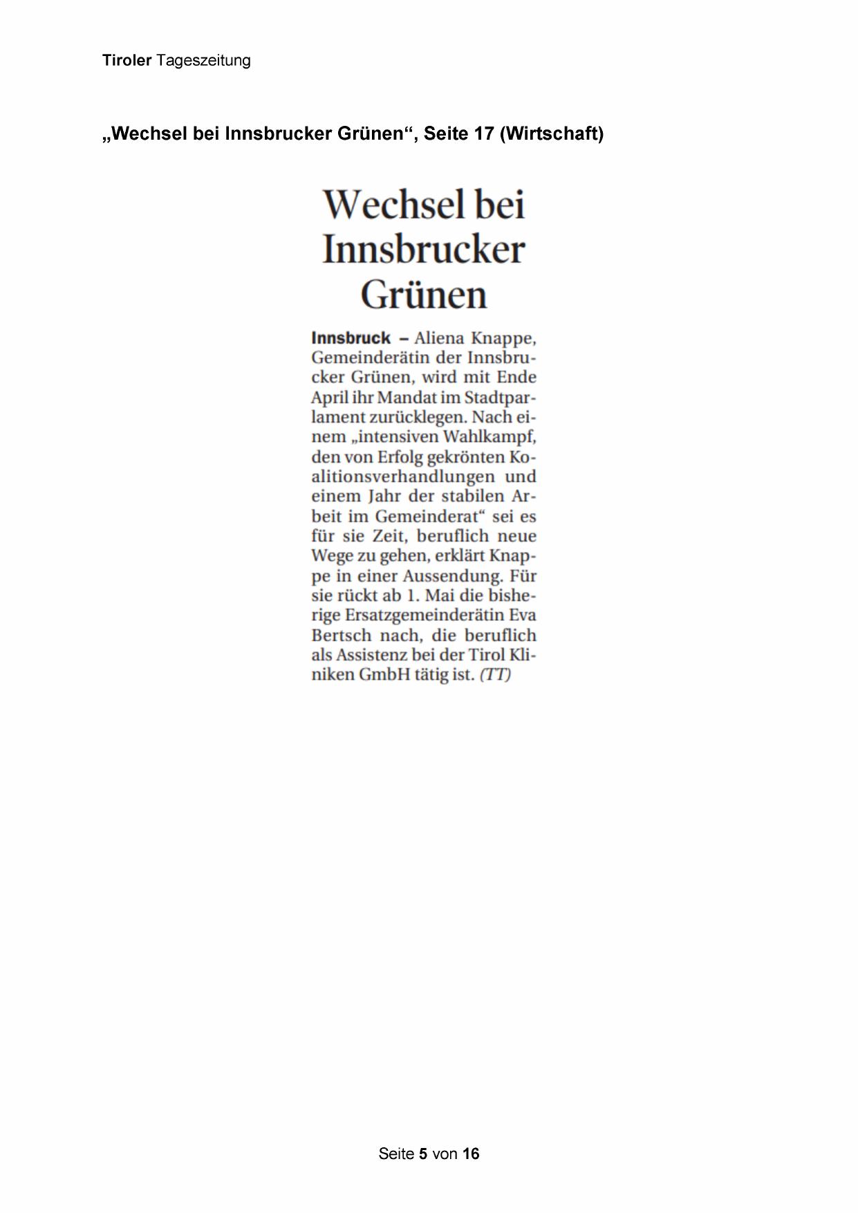 „Wechsel bei Innsbrucker Grünen“, Seite 17 (Wirtschaft)