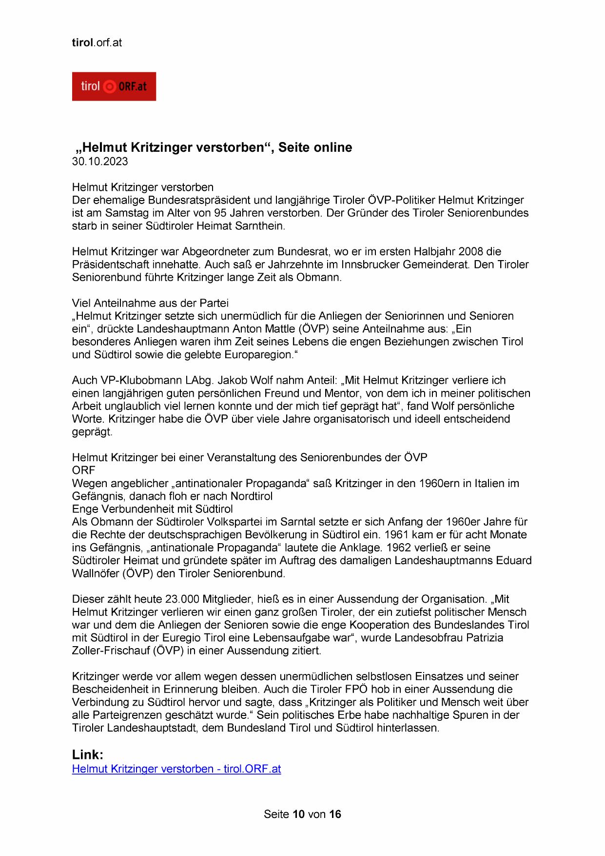 Verbindung zu Südtirol hervor und sagte, dass „Kritzinger als Politiker und Mensch weit über