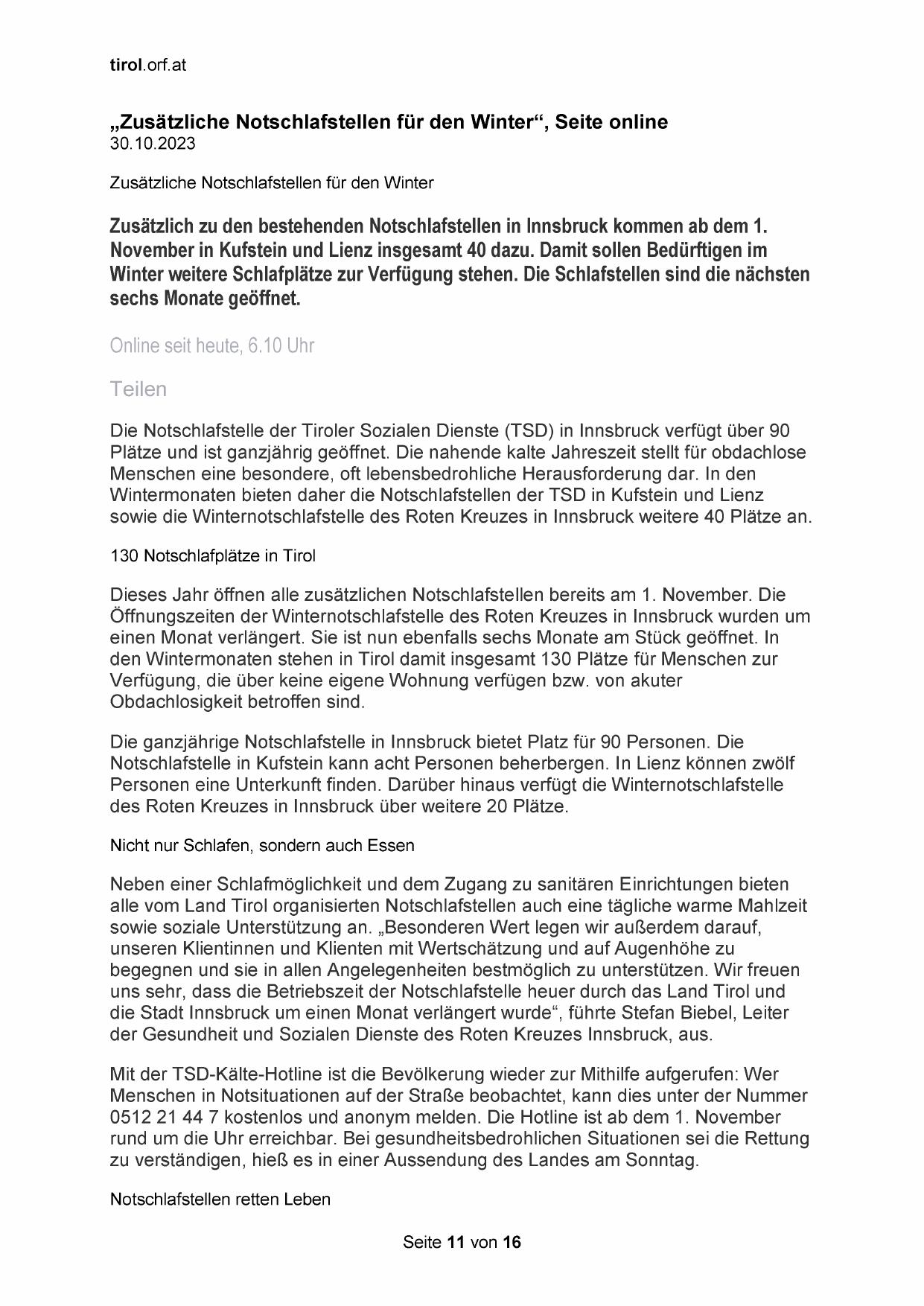 „Zusätzliche Notschlafstellen für den Winter“, Seite online