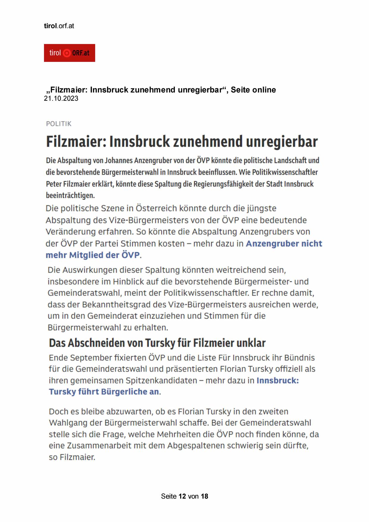 „Filzmaier: Innsbruck zunehmend unregierbar“, Seite online